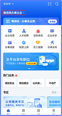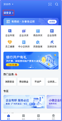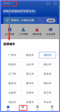 登录“粤商通”App后,app会默认选择深圳市。如果不是深圳市,则在【服务】手动选择【深圳市】,如下图所示。