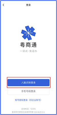 在“粤商通”APP首页,点击【请登录】-【人脸识别登录】,人脸识别后返回“粤商通APP”。