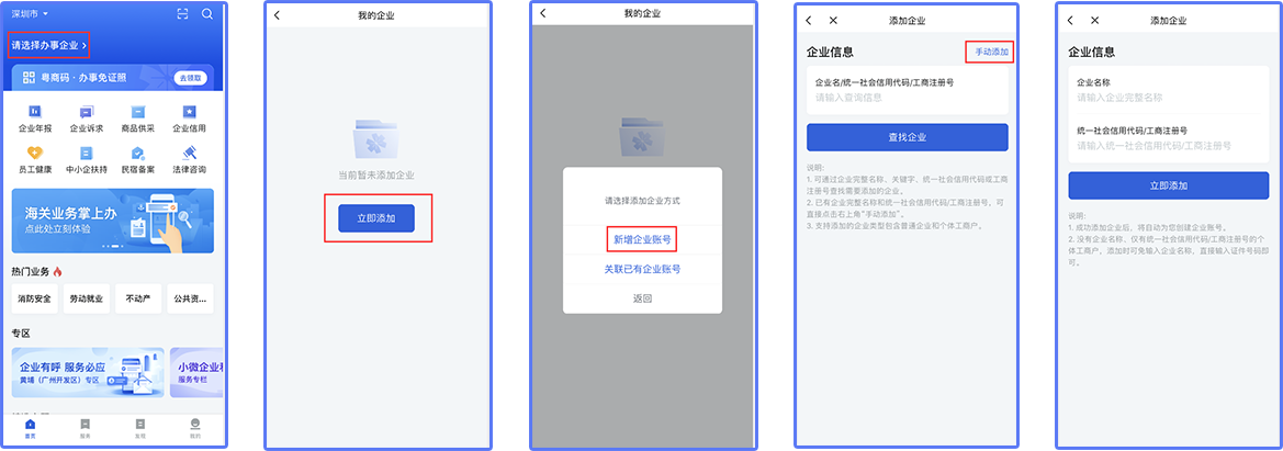 1.如果您已在广东省政务服务网四级(原L2)或以上的法人账号,经办人可使用该法人账号/密码登录“粤商通”,点击【经办人管理】将自己添加为该账号的授权经办人。添加成功后,即可获得。经办人也可刷脸登录“粤商通”,点击【我的企业】-【添加企业】-【已有法人账号,去关联】,输入该法人账号进行【申请关联】;