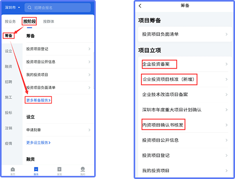 在【首页】选择【服务】-【按阶段】-【筹备】【-更多筹备服务】-【项目立项】即可申报深圳市发展和改革委员会企业投资备案、企业投资项目核准(新增)、内资项目确认书核发三个事项