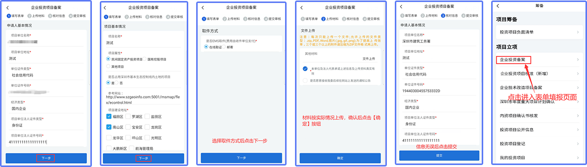 资料填报:用户点击【企业投资备案】事项后进入信息填报页面,用户根据表单提示依次填报信息,确认无误后即可提交审核。