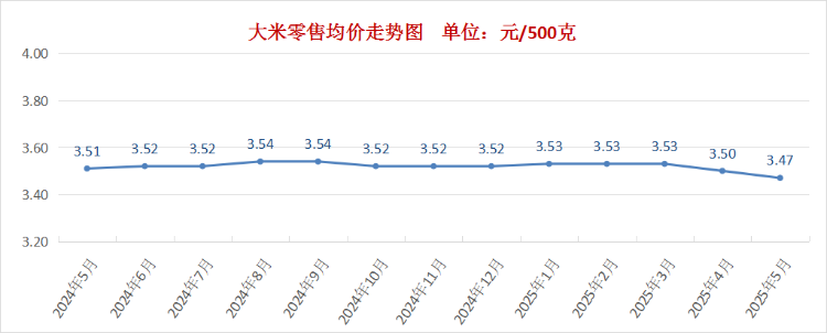 粮食供应稳定充足。5月份,我市大米零售均价为每500克3.47元,环比下降0.9%,与去年同期相比下降1.1%。面粉零售均价为每500克3.04元,环比下降0.3%,与去年同期相比下降2.6%。
