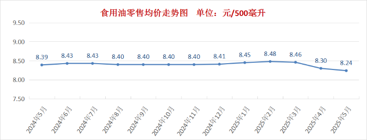 食用油供应充足,价格小幅下降。5月份我市食用油零售价格为每500毫升8.24元,环比下降0.7%。其中,花生油零售均价为每500毫升11.25元,环比下降1.2%;菜籽油零售均价为每500毫升8.18元,环比下降0.8%;豆油零售均价为每500毫升6.29元,环比下降0.5%;调和油零售均价为每500毫升7.22元,环比持平。