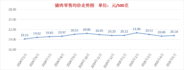 养殖端出栏积极性不高,对生猪价格走势有一定的支撑。中央连续启动冻猪肉轮换收储工作,缓解阶段性供应压力,叠加端午节前备货需求,猪肉价格略有上涨。5月份我市猪肉零售均价为每500克20.18元,环比上涨0.9%。