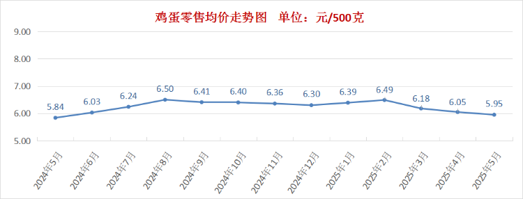 随着气温回升,蛋鸡产蛋率提高,进一步提升了市场供应量,当前产蛋鸡存栏量处于历史同期高位,市场需求疲软,鸡蛋价格继续下降。5月份我市鸡蛋零售均价为每500克5.95元,环比下降1.7%。