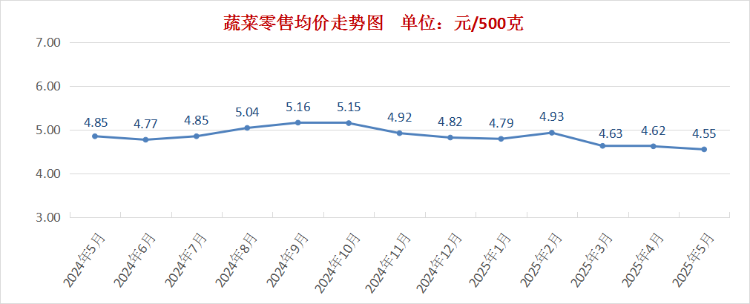 天气整体以晴好为主,蔬菜季节性产量增加,供应充足推动价格继续下行。5月份我市蔬菜零售均价为每500克4.55元,环比下降1.5%。其中,叶菜类零售均价为每500克4.69元,环比下降1.3%;根块瓜豆类零售均价为每500克4.43元,环比下降1.6%。