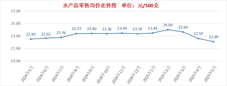 水产品市场回暖,降幅放缓。5月份我市水产品零售均价为每500克22.09元,环比下降2.2%。其中,海产品零售均价为每500克33.69元,环比下降1.5%。淡水鱼零售均价为每500克10.48元,环比下降4.6%。