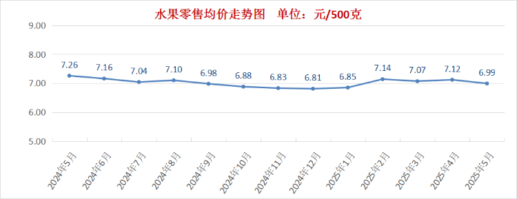 水果市场货源充足,价格下降。5月份我市水果零售均价为每500克6.99元,环比下降1.8%。其中,橙子零售均价为每500克6.13元,环比下降0.2%;苹果零售均价为每500克7.71元,环比下降2.9%;葡萄零售均价为每500克13.91元,环比下降3.4%;西瓜零售均价为每500克3.71元,环比下降5.4%;香蕉零售均价为每500克4.67元,环比上涨2.9%;梨零售均价为每500克5.84元,环比上涨1%。