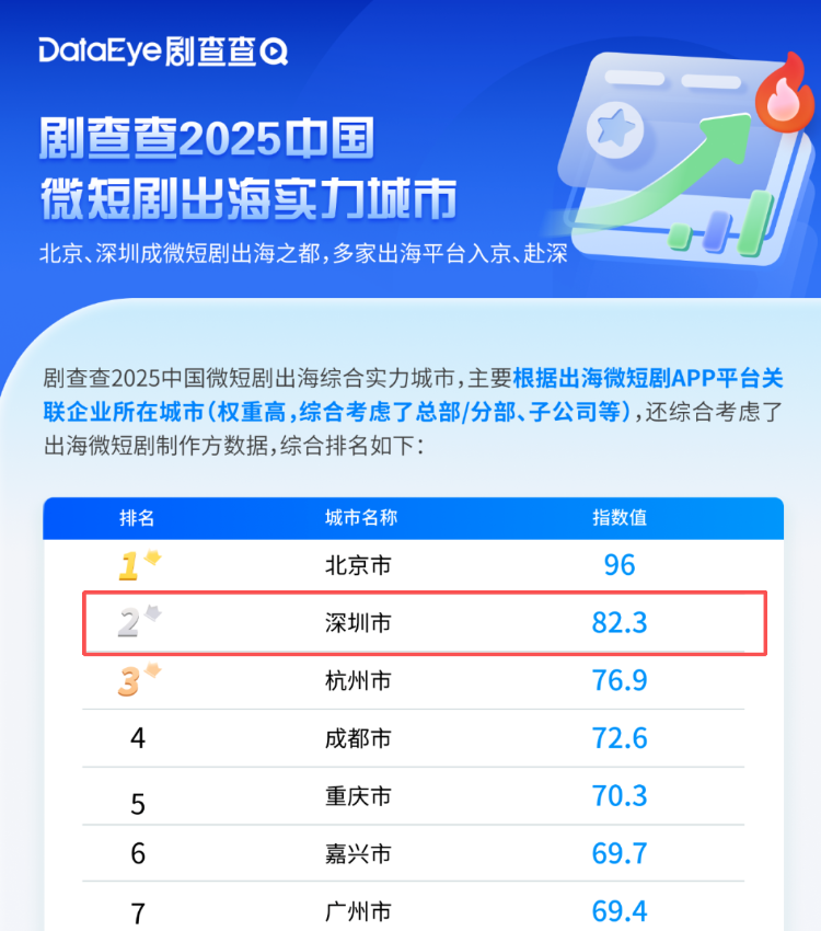 同时,深圳的科创优势在微短剧、漫剧的科技赋能、发行营销方面表现突出,成为另一加分项。今年底,中央广播电视总台与深圳共创的短剧集《奇迹》将播出,同时,聚集80+微短剧明星的第二届DataEye剧查查之夜将在12月于深圳盛大举办,深圳有望在微短剧+城市国内传播维度获取更高分数。