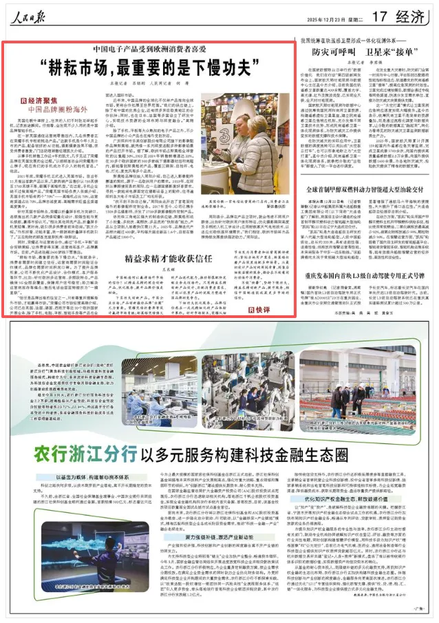 12月23日,人民日报刊发记者吕绍刚、人民网记者何蒨的文章《中国电子产品受到欧洲消费者喜爱 “耕耘市场,最重要的是下慢功夫”》,聚焦深圳品牌荣耀和斯莫格通过深入理解欧洲市场需求、提供适配产品及服务,成功赢得当地消费者信任并开拓了市场。以下是全文。