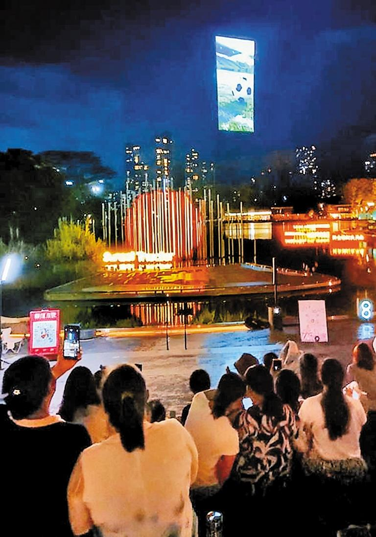 “激情全运会 活力大湾区”“十五运 为你更精彩”“魅力全运 活力深圳”……一条条全运会标语在飞天屏上浮现,全运会足球赛事宣传片也在飞天屏上循环播放。台阶座椅上、湖畔上、沿湖跑道上,处处都是观赏飞天屏表演的人们。许多市民还拨打视频电话与亲朋好友实时分享感受:“看,好美!”“实在太有意思了!”