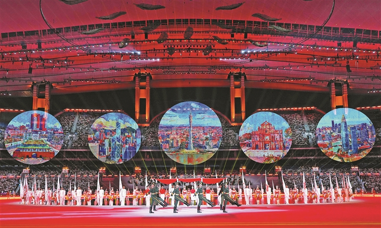 这幅长达174米的数字画卷以9块圆形屏幕联动呈现,生动描绘出广州塔“小蛮腰”、港珠澳大桥、澳门大三巴牌坊等粤港澳大湾区标志性景观。画面既保留了油画的厚重质感,又融入数字艺术的灵动韵律,充分诠释了开幕式“山水相依、风土同源”的艺术主题。