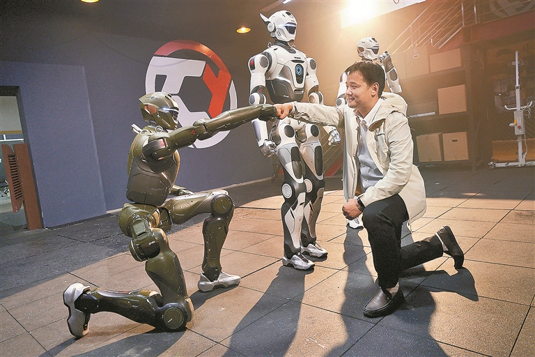面对人工智能浪潮,深企持续加大研发投入,把创新力转化为产品力。图为众擎机器人发布的全尺寸通用人形机器人T800。该机器人可适应工业搬运、精细分拣等场景。公司计划2027年实现年产1万—2万台,推动人形机器人向规模化产业落地。深圳特区报记者 刘钢摄