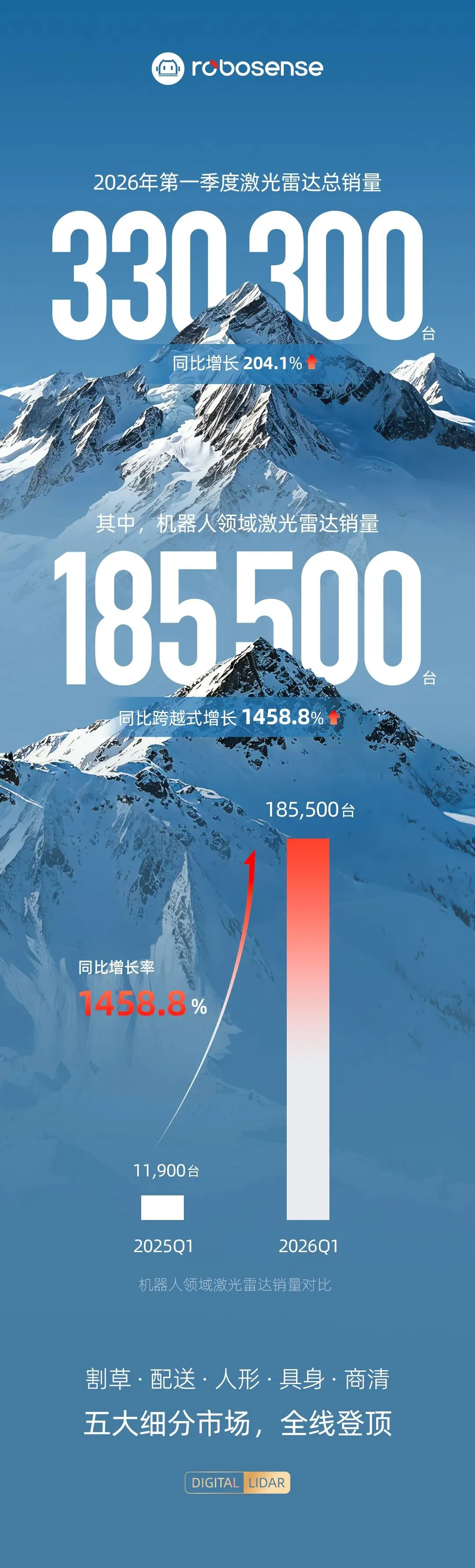 继2025年销量突破30.3万台登顶行业第一后,RoboSense速腾聚创机器人领域激光雷达销量维持高增长势头,已经斩获割草、无人配送、人形、具身智能、商清机器人五大细分市场行业第一,实现泛机器人市场的全面领跑。