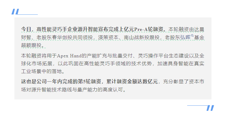 深圳新闻网2026年4月16日讯(记者 王睿)4月15日,深圳高性能灵巧手企业源升智能宣布完成上亿元 Pre-A 轮融资。本轮融资由达晨财智、老股东春华创投共同领投,渶策资本、南山战新投跟投,老股东弘晖基金超额跟投。