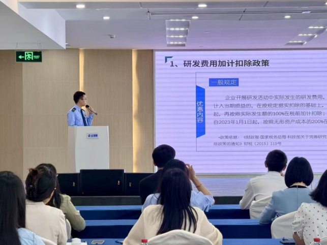 科技型企业是南山区产业发展的主力军,精准享受税收优惠政策是其轻装上阵、加速创新的关键。活动伊始,前海税务局业务骨干,开展了“税收优惠政策深度解读”。从研发创新、人才吸引、资金支持三个方面讲述科技型企业税收优惠政策,重点阐述研发费用加计扣除、粤港澳大湾区个人所得税优惠政策、科学技术行业留抵退税政策等,解决企业“政策不理解、优惠不会享”等难题,帮助企业将“政策红利”转化为“发展动力”,有效减轻资金压力,激发创新活力。