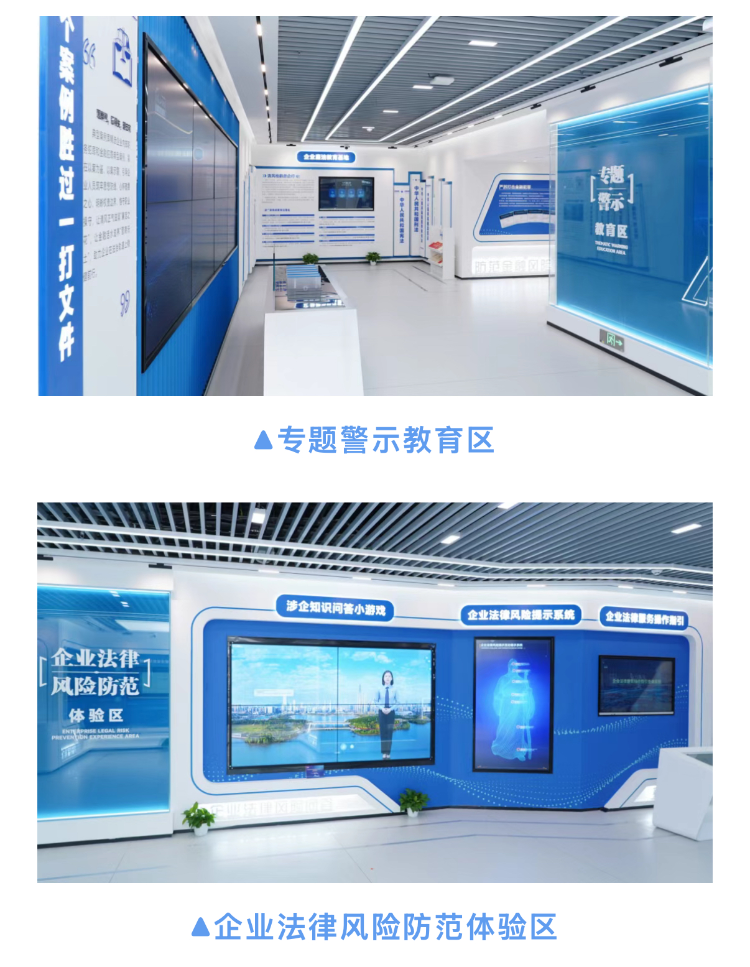 该体验中心充分发挥“深圳市五星级法治宣传教育基地”作用,打造“金融犯罪警示教育”和“企业廉洁教育”两个主题阵地,助力企业防范金融风险、强化廉洁自律意识。线下设置迎宾区、法治化营商环境综述区、专题警示教育区、企业法律风险防范体验区、企业法律服务需求对接区和、识产权保护分馆等六大板块,线上依托小程序、公众号等平台,企业人员可通过报名邀约、“元宇宙体验”等入口,进入“线上体验馆”进行互动式的体验。