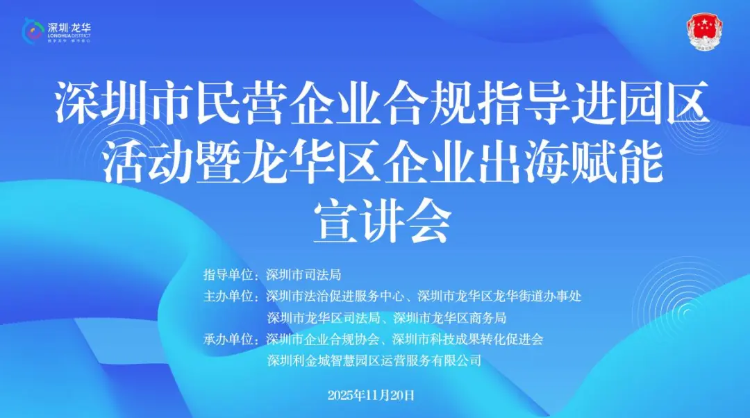 活动由深圳市司法局指导,深圳市法治促进服务中心、龙华区龙华街道办事处、龙华区司法局、龙华区商务局主办,深圳市企业合规协会、深圳市科技成果转化促进会承办,利金城智慧园区支持。