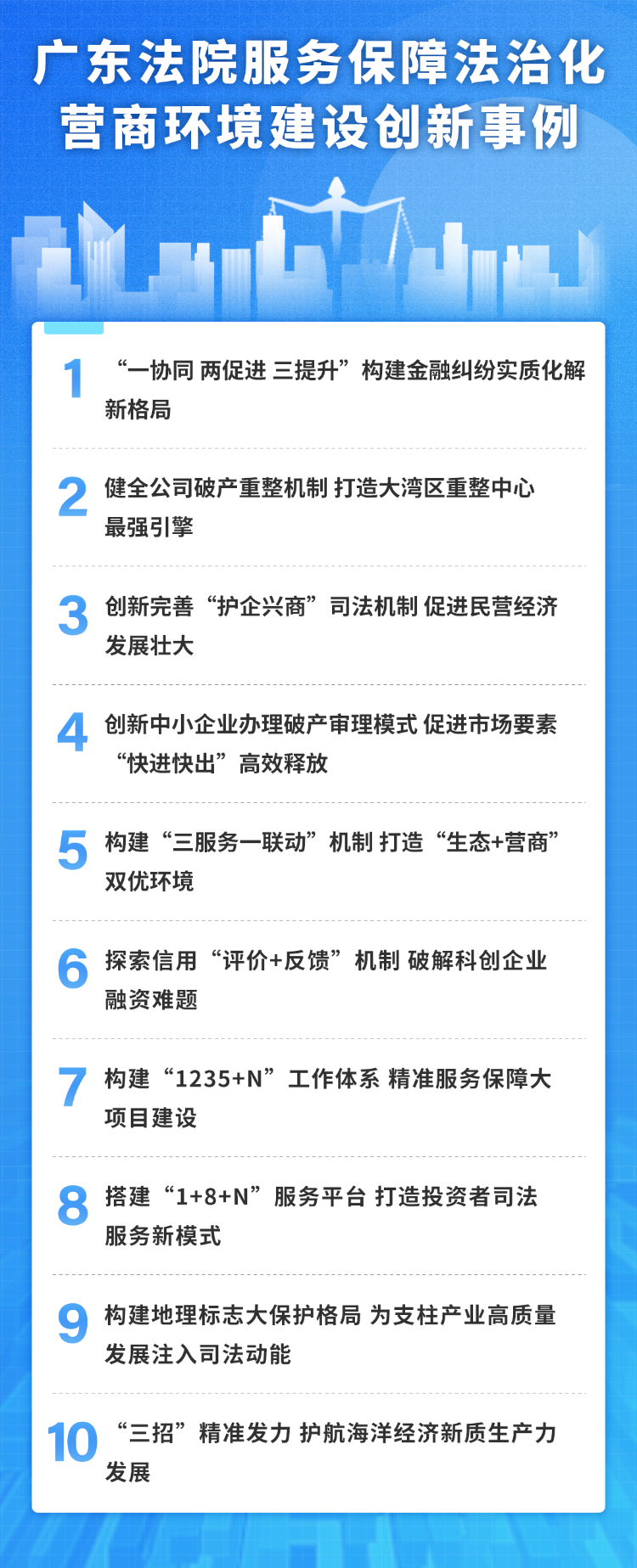 本次发布的10个创新事例,涵盖金融纠纷实质化解、困境企业拯救、中小企业破产办理、地理标志协同保护、海洋经济发展护航、重大项目服务保障等多个关键领域,体现了广东法院面对超大体量案件的压力与挑战,主动将审判工作融入经济社会发展大局的生动实践。