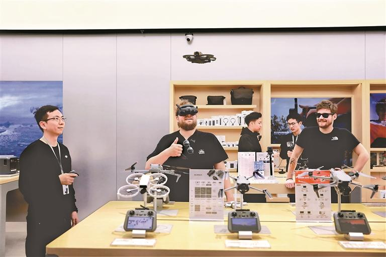 深圳科技潮品畅销全球。图为华强北大疆旗舰店内,海外客商在体验无人机产品。深圳特区报记者 刘文英摄