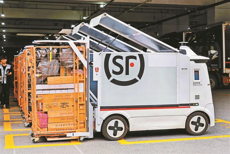 深圳在“无人机+无人集卡+无人小车”的物流配送场景上形成创新示范。图为龙华顺丰转运站内的无人车。深圳特区报记者 赖犁摄