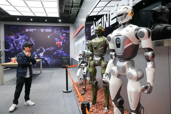 1月15日,在深圳市福田区深业上城的众擎机器人门店,顾客参观具身机器人。新华社记者 梁旭 摄