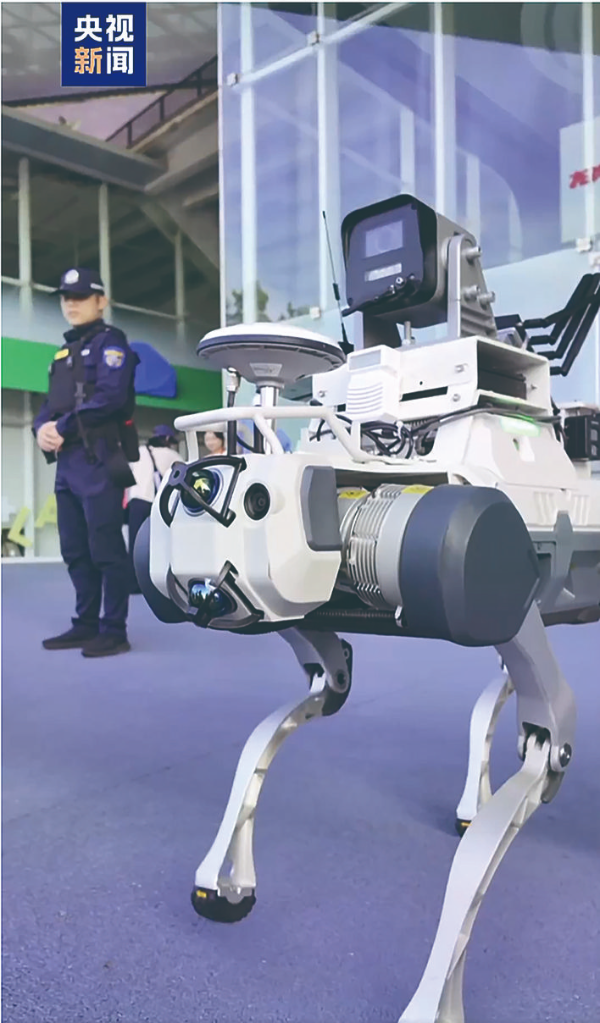 在深圳大运中心场馆入口处,四足机器狗开展精准巡逻,守护赛事安全。