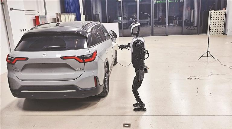 乐聚夸父人形机器人在测试场景中为车辆充电。