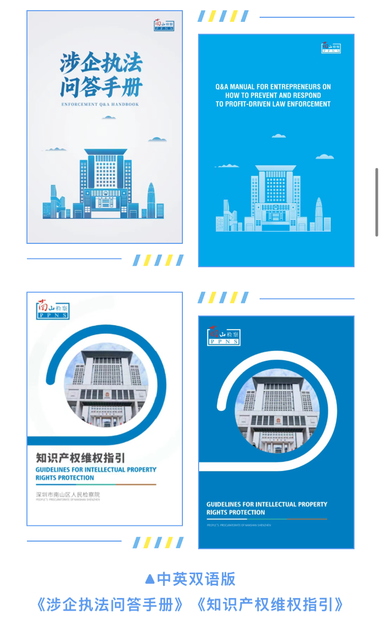 “《涉企执法问答手册》和《知识产权维权指引》均由南山区检察院检察人员自编自译,旨在为辖区企业包括外资企业提供专业、便捷的法律参考和维权指引,依法平等保护各类经营主体的合法权益,服务高质量发展和更高水平对外开放。”李丽华检察长介绍道。