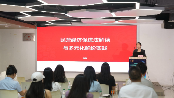 随后,调解专家张隽围绕多元纠纷解决机制方面,深入剖析民营经济矛盾纠纷的系统化解路径,重点介绍以深圳市民营经济组织解纷中心为代表的“平台化+专业评估”实践模式。该模式已在买卖纠纷、专利争议等典型案件中取得显著成效,展现调解机制在低成本、高效率解决争议方面的优势,成为民营企业稳健发展的“润滑剂”“稳定器”和“护航人”。