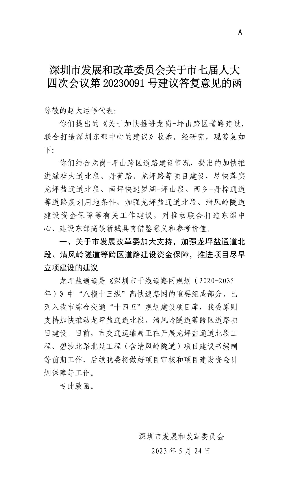 深圳市发展和改革委员会关于市七届人大四次会议第20230091号建议答复意见的函