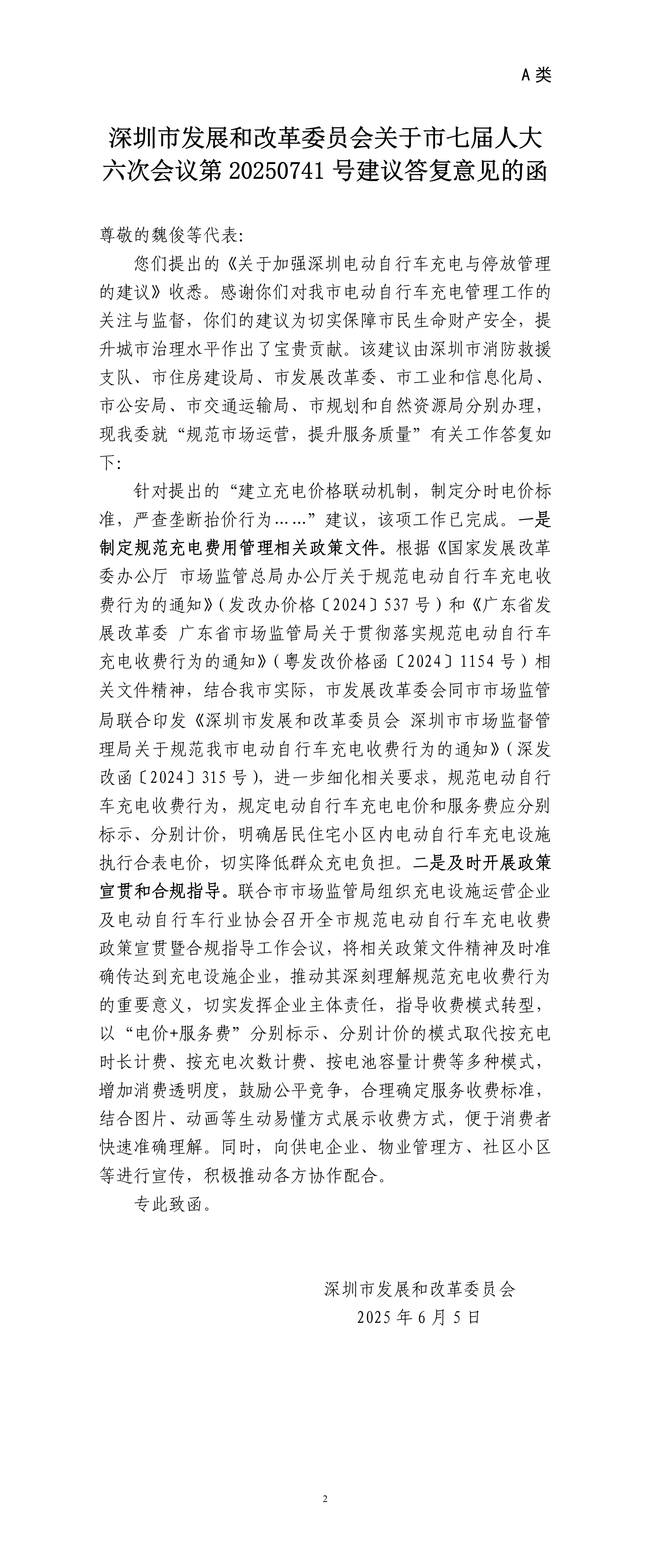 深圳市发展和改革委员会关于市七届人大六次会议第20250741号建议答复意见的函