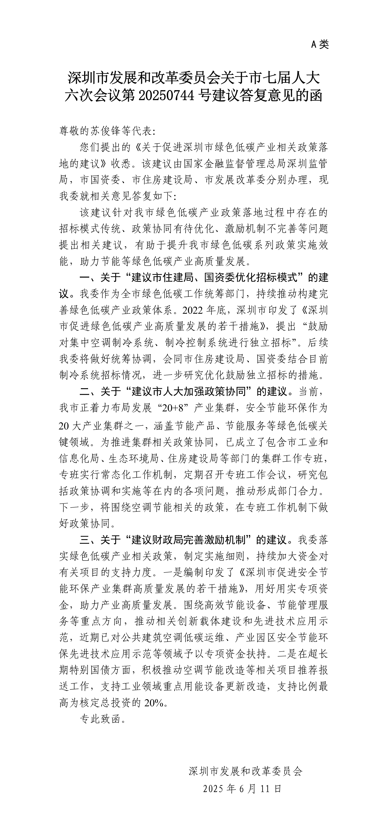 深圳市发展和改革委员会关于市七届人大六次会议第20250744号建议答复意见的函
