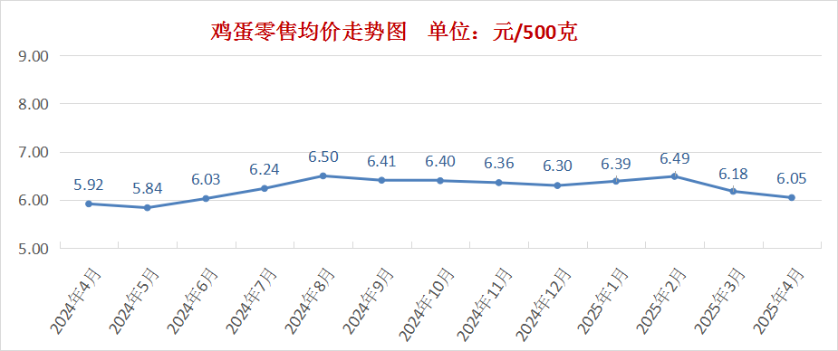 蛋鸡存栏量持续增加,产蛋率继续提升,鸡蛋处于传统消费淡季,价格继续下降。4月份我市鸡蛋零售均价为每500克6.05元,环比下降2.1%。与去年同期相比,鸡蛋价格上涨2.2%。